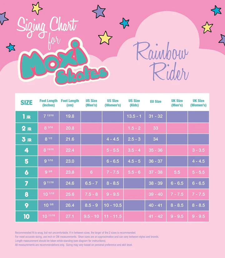 The Moxi Rainbow Rider is designed for the beginner/casual skater looking for an outdoor roller skate packed with high-quality comfort at an affordable price. The Rainbow Rider features a reliable boot made of vinyl uppers and a padded, soft lining that is comfortable to the skin for a supportive and care-free stride. Rainbow-themed graphics and a no-maintenance PVC outsole round out the boot, which is attached to a durable die-cast aluminum plate, soft outdoor wheels (82A), ABEC-5 bearings, and an adjustable toe stop to ensure a smooth, cruiser-friendly ride. Brimming with attention to detail and thoughtful touches, the Rainbow Rider is an undeniable value for the beginning or casual outdoor skater. It will leave you feeling like you are gliding on rainbows!